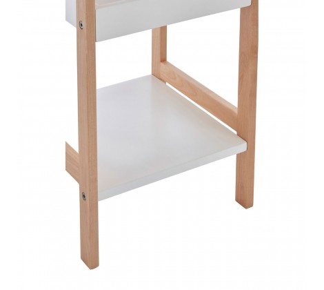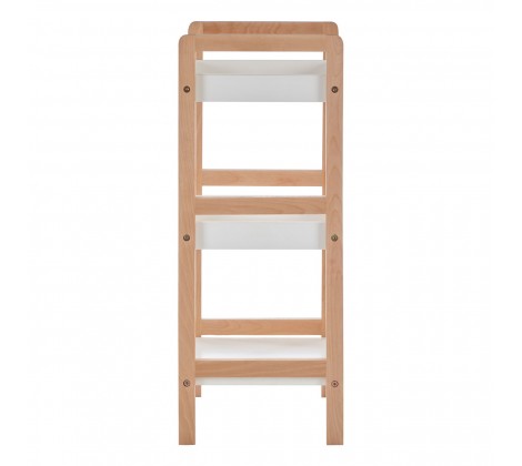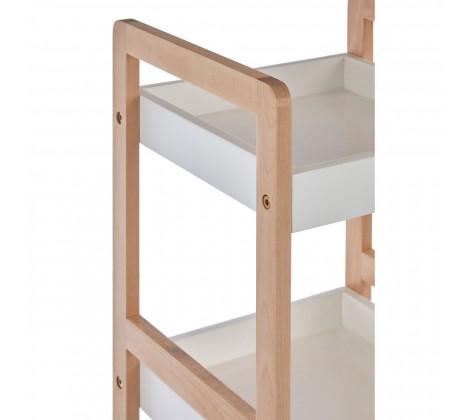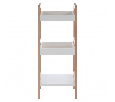 This shelf unit features a clean lined, open frame made from renewable birchwood in a natural tone with a lacquer finish. Three square shelves made from MDF are securely attached to the stand to store bathroom accessories. Their smooth white colour contrasts the light wooden hues making it suitable for a nordic-themed bathroom.