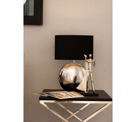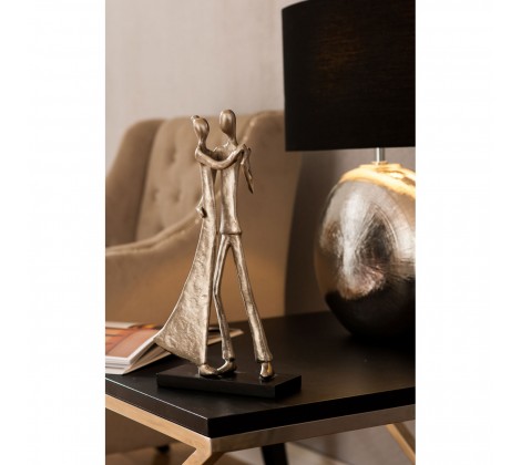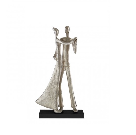 Both figures stand on a low profile rectangular aluminium stand. Its black colour contrasts with the couple’s silver finish. The dress of the female swells out at the back, creating the impression of movement, as does the bent knee of the male. Its textured silver surface makes this graceful sculpture glisten under the light. Crafted by hand, display it with other metallic accessories.